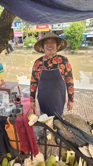 Twice during the cruise, we chose bike rides; a great way to see how people really live in rural southeast Asia. The first was on an island in the middle of the river, with access only by ferryboat. There were just three of us on the ride, so even though we were with a guide, it felt more like a casual spin than a guided tour. We stopped along the way for homemade popcorn – kernels roasted in an oven then whacked with an iron plate for a real pop - and fresh coconut water from fruit cut open by a young man in Manchester United sandals when we arrived at his tiny roadside stand.